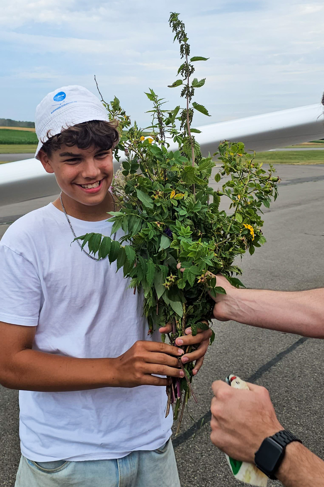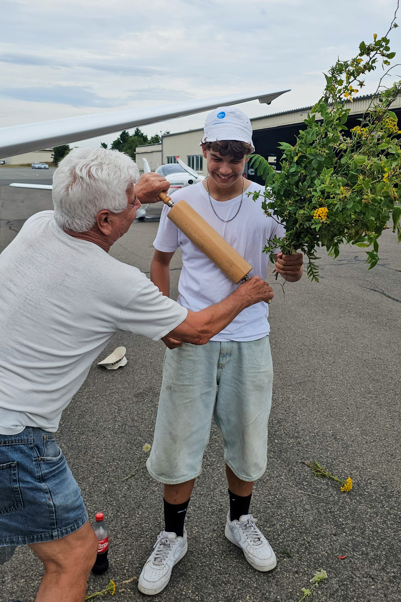Die zahlreich erschienenen Gäste beglückwünschten Ferdi und wohnten dem unter Segelflieger üblichen Ritual bei: Zuerst wurde durch Fluglehrer "Wolle" der traditionelle Brennnesselstrauß überreicht, den Ferdi mehr oder weniger tapfer entgegennahm. Der Legende nach sorgt der "brennende Strauß" für das nötige Feingefühl in der Hand, und die Anschließenden "Popo-Klatscher" durch alle Anwesenden sorgt für das nötige Feingefühl im Hosenboden fürs Aufspüren der Thermik.