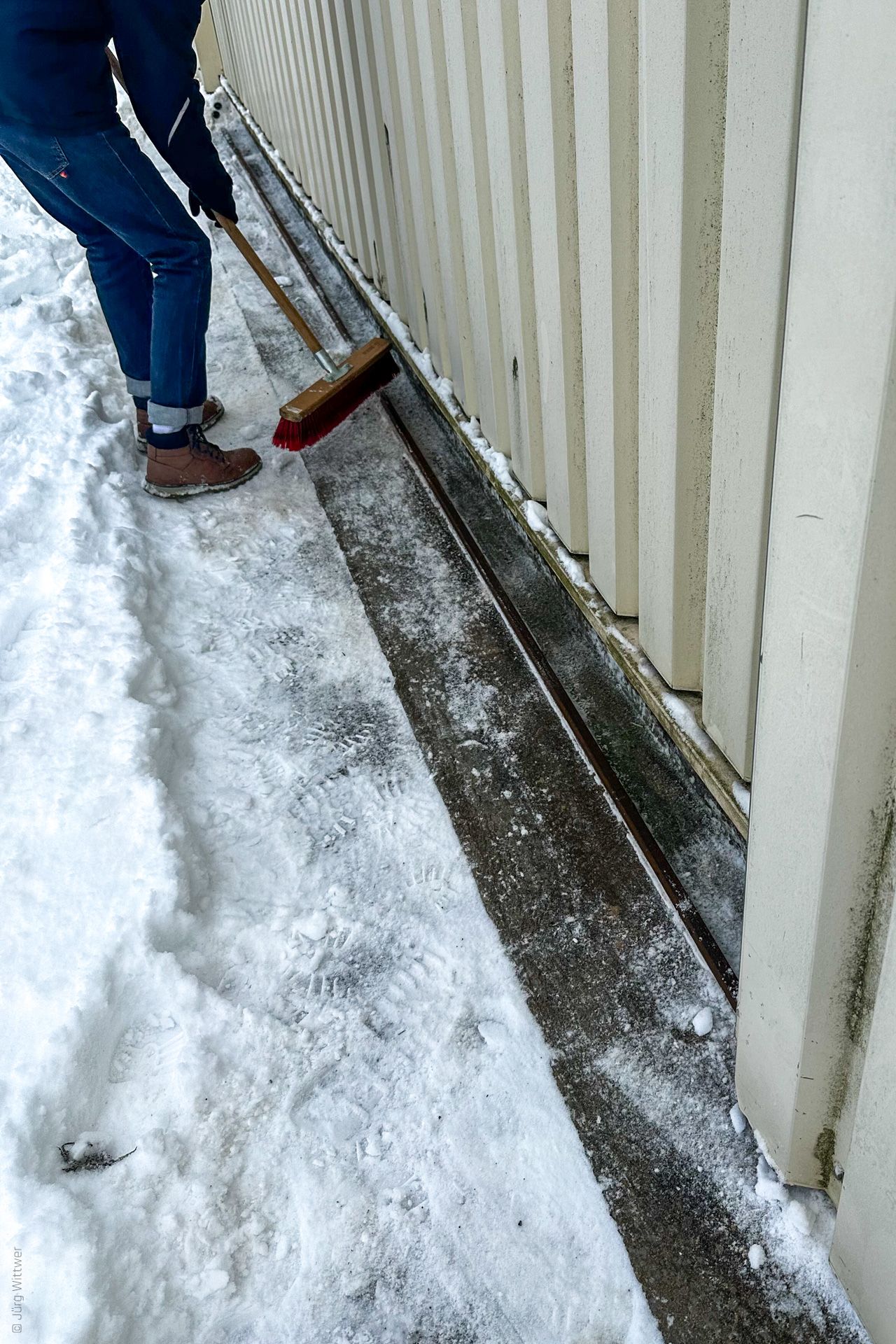 - Unbedingt die Schienen der Hallentore schneefrei machen - vor dem ersten Öffnen! Wenn sich der Schnee nämlich erst mal unter den Toren "verteilt" hat, friert alles ein, und die Tore lassen sich dann auch mit vereinten Kräften nicht mehr bewegen.